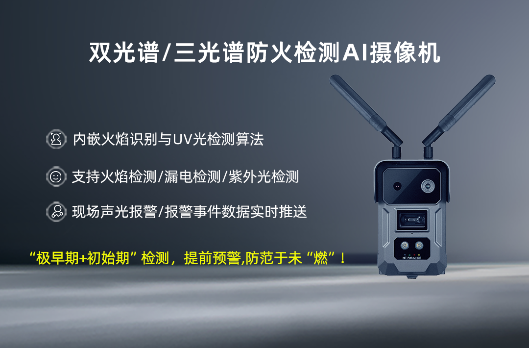 “高清可见光+高灵敏度UV光”防火预警AI卡片机集成了图形火焰识别算法与UV光检测融合识别技术一体,覆盖场景广、精度高、低误报